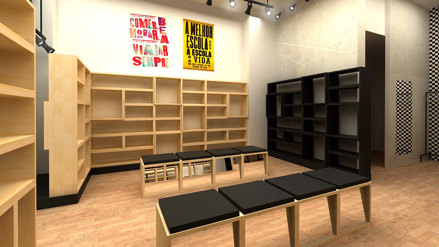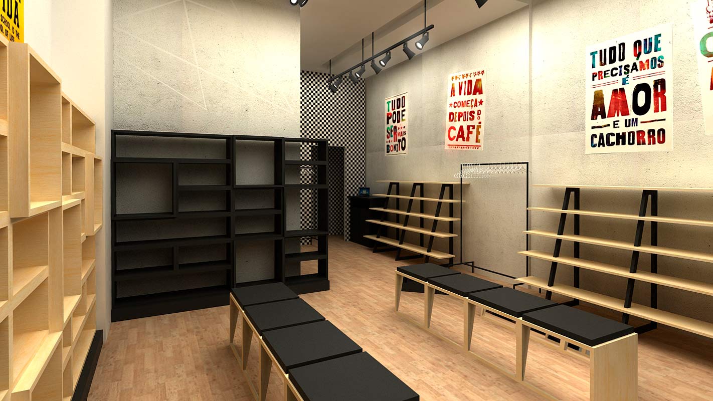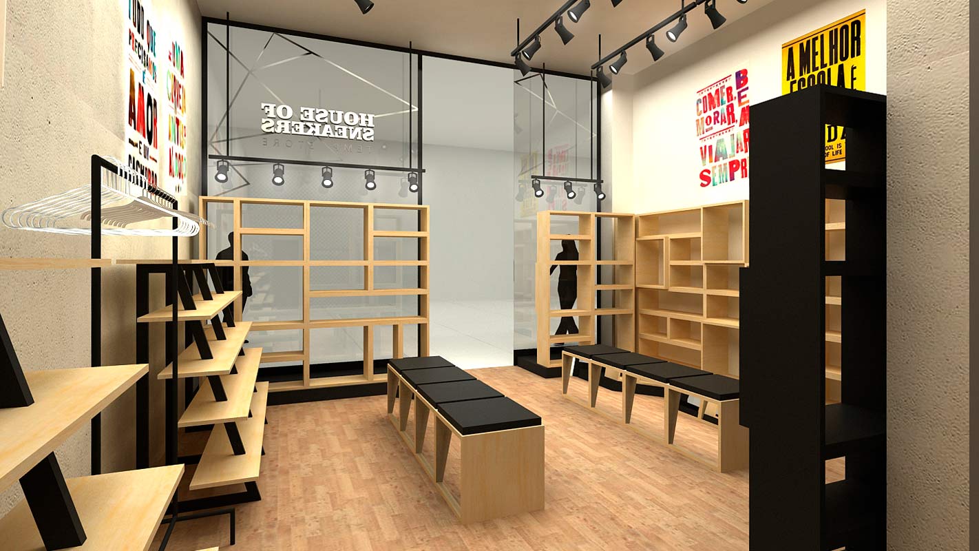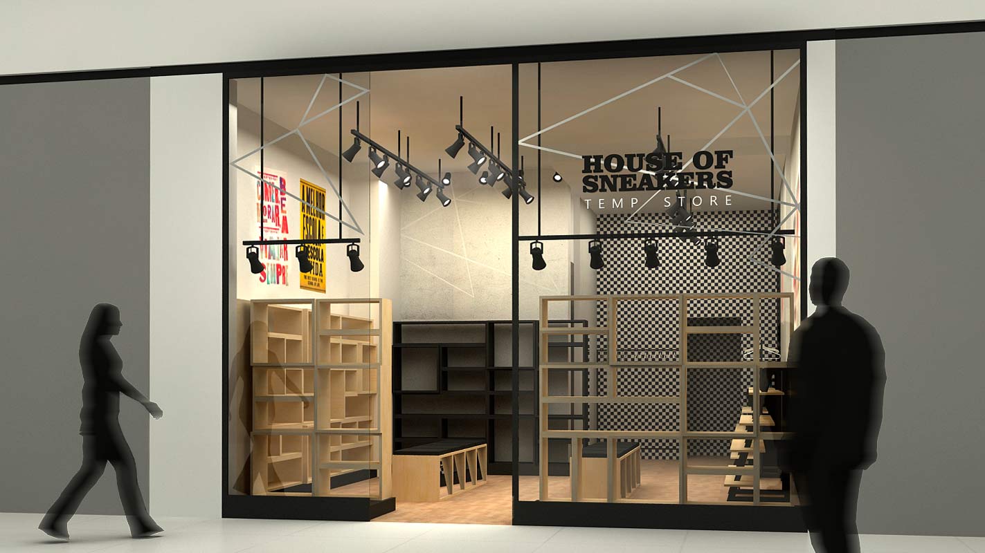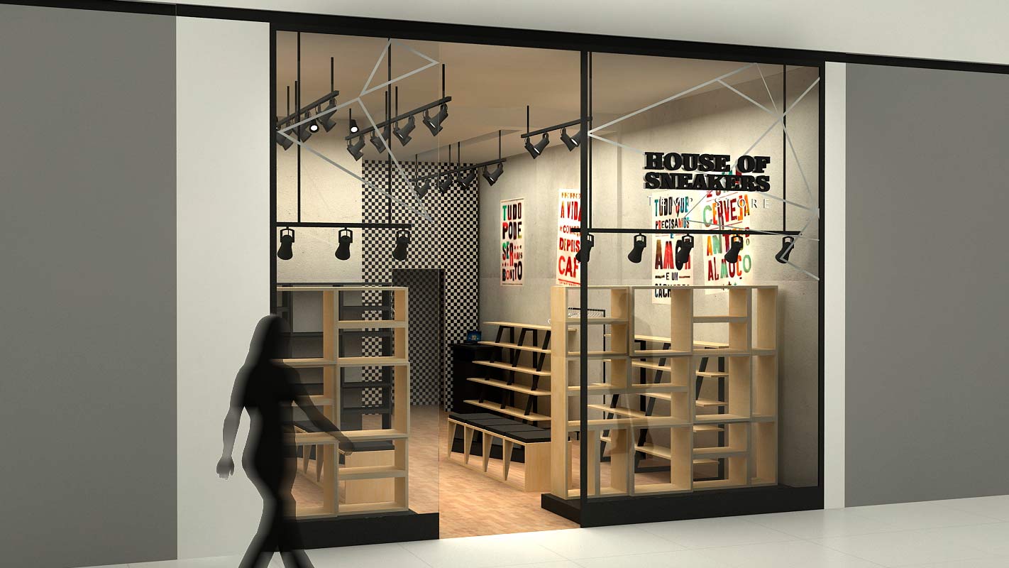 Projeto piloto de novo conceito de loja de shopping para a marca de tênis e acessórios masculinos e femininos, House of Sneakers.
