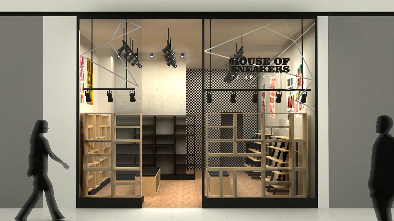 Projeto piloto de novo conceito de loja de shopping para a marca de tênis e acessórios masculinos e femininos, House of Sneakers.