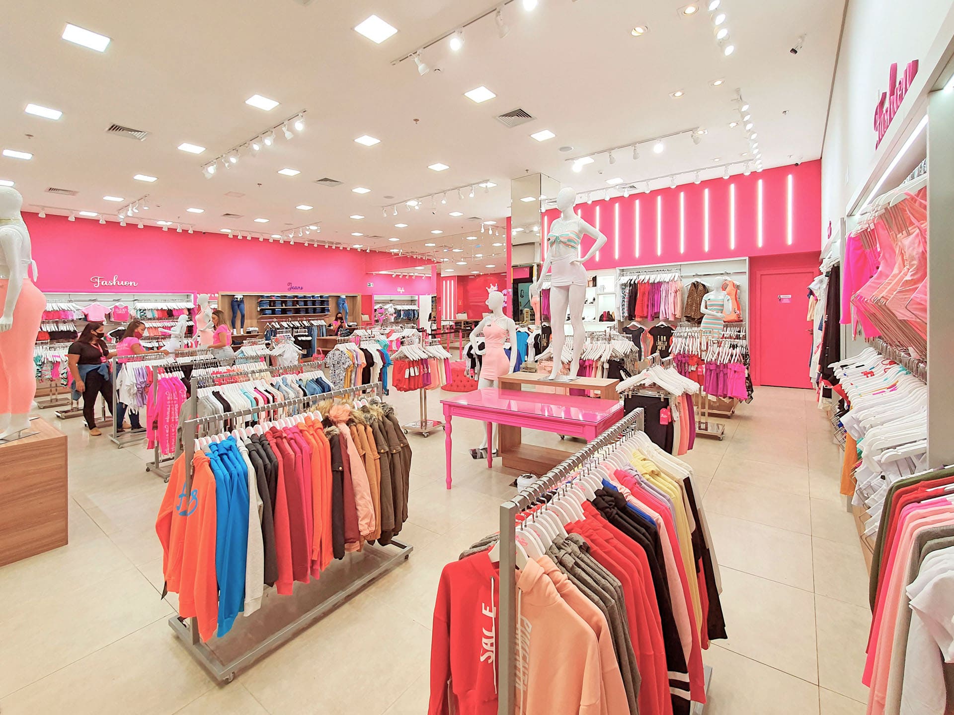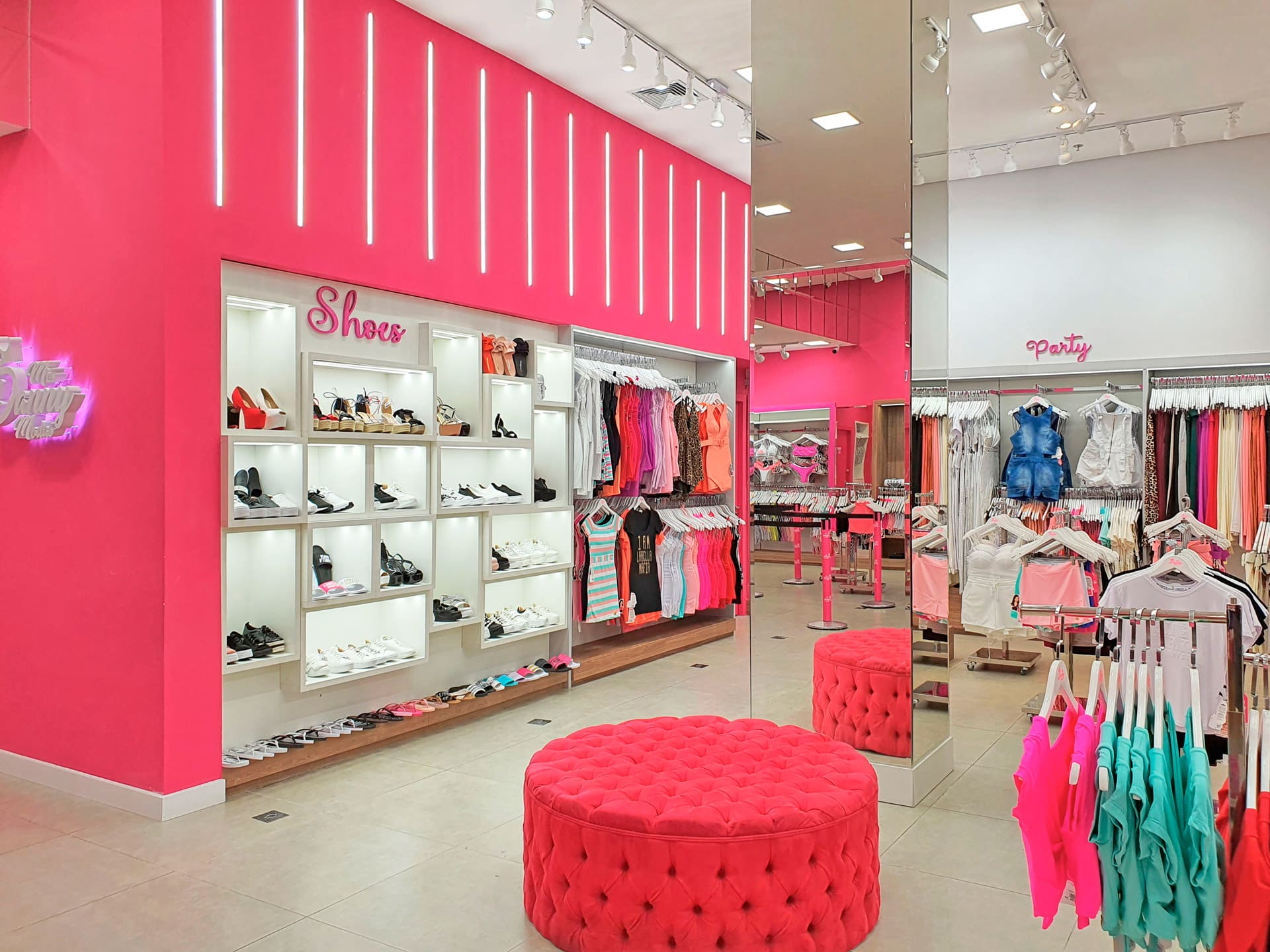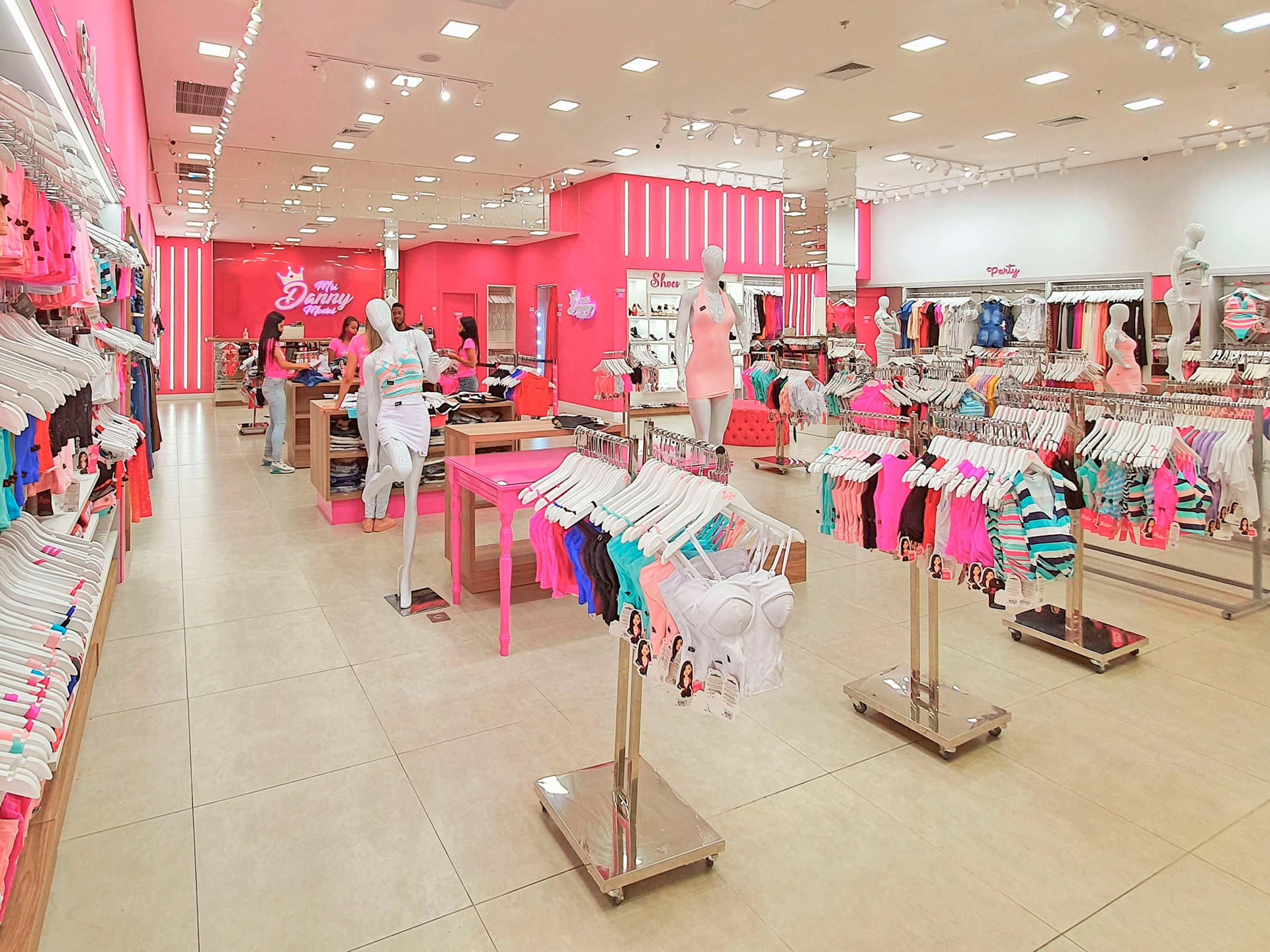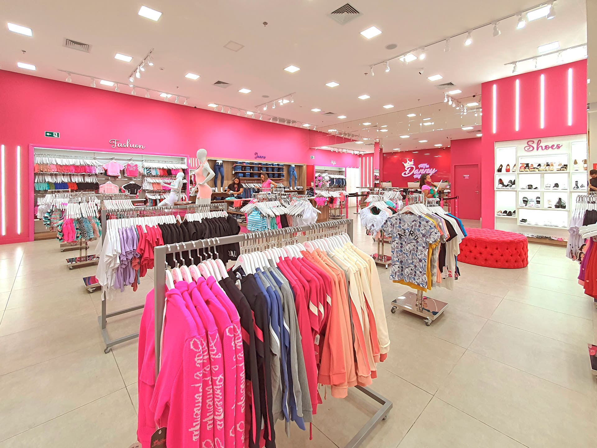 É com muito pink e muito brilho que a Mrs Danny Modas faz sucesso, uma loja em que se formam filas de consumidoras que, muitas vezes, precisam entrar sem seus acompanhantes devido ao grande movimento. A loja, que começou no centro de Itaquera, zona leste de São Paulo, inaugurou no Shopping Metro Itaquera em um espaço de 45m², com projeto da ARKT Varejo, e, em pouco mais de um ano, já se mudou para um novo espaço de 240m² no mesmo shopping.