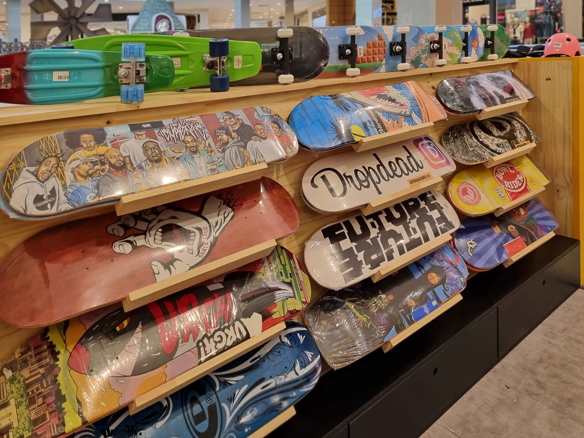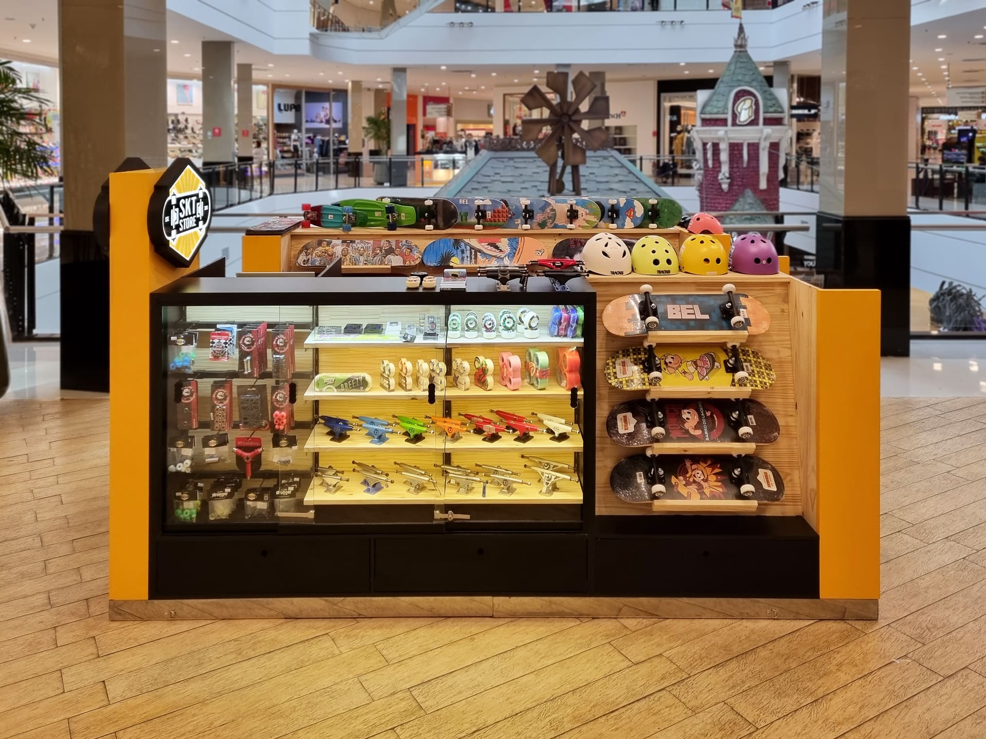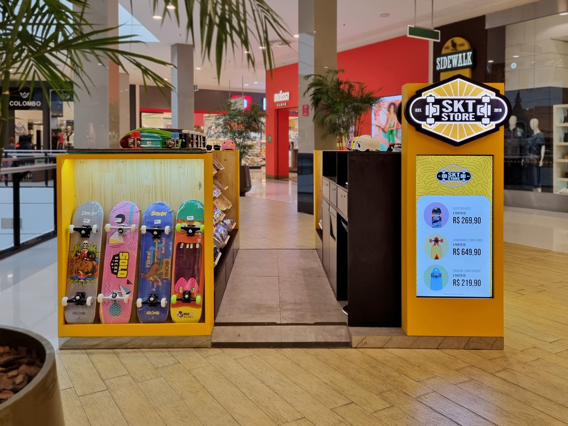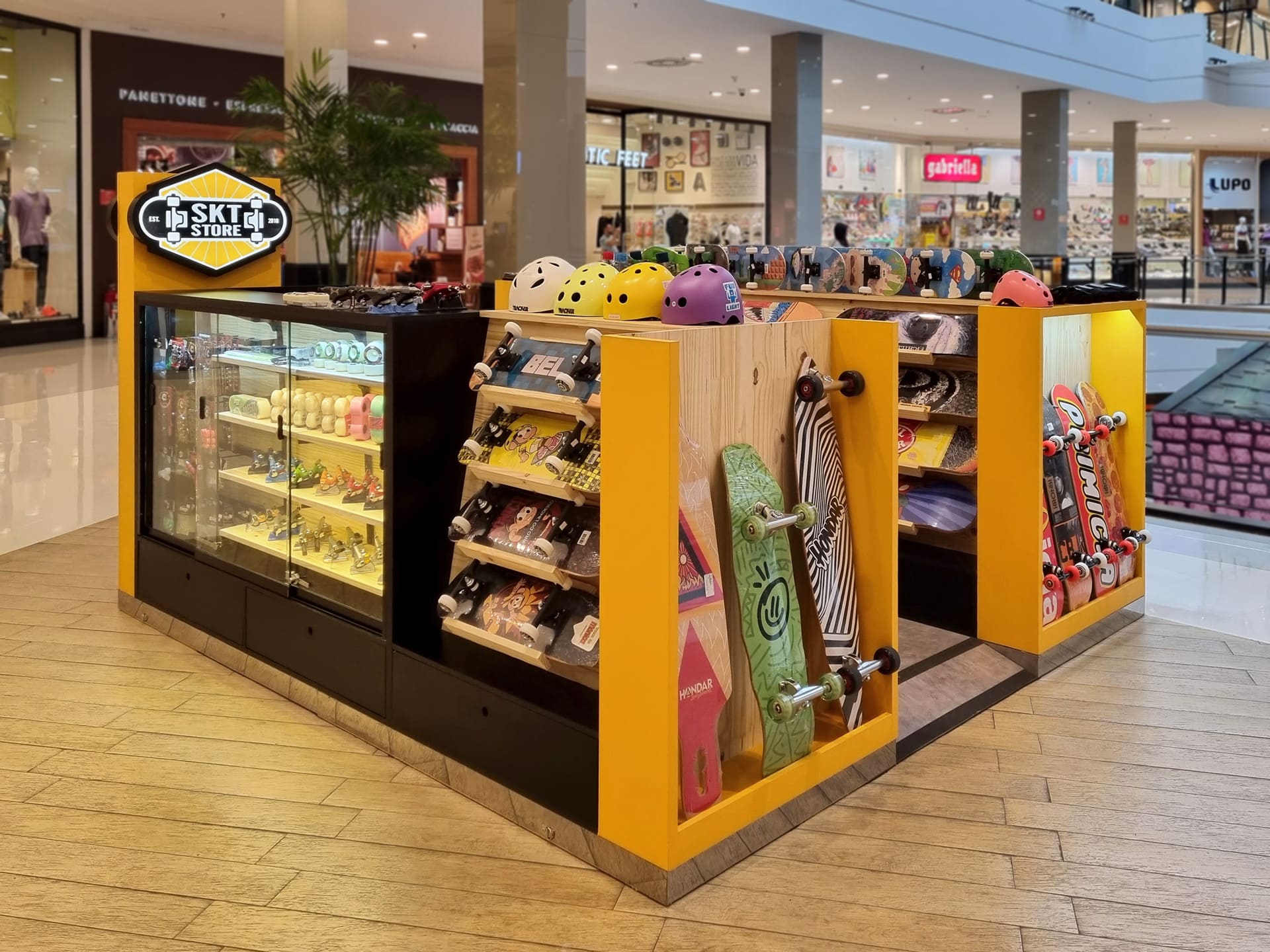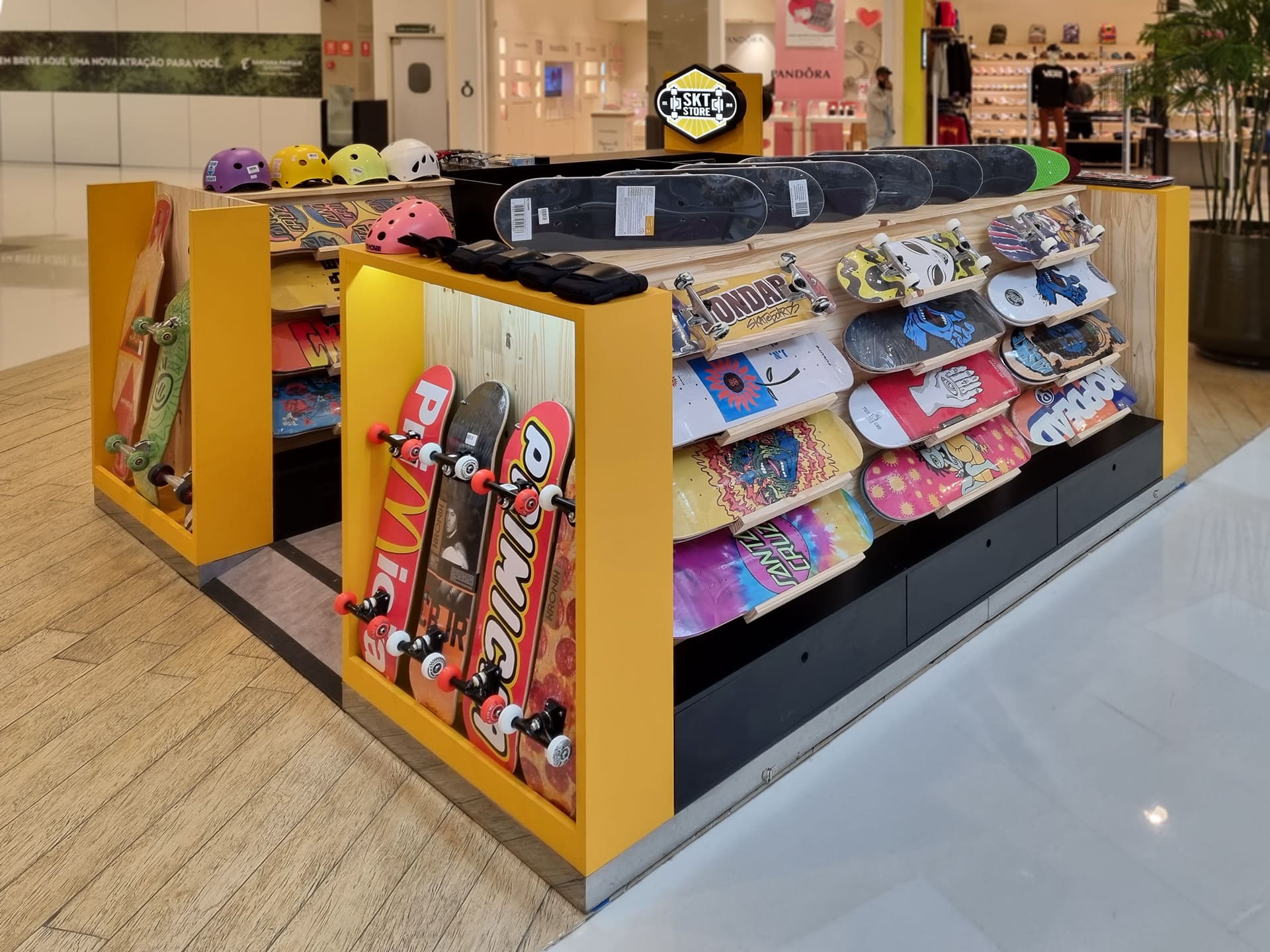 Neste projeto, desenvolvido para a SKT Store, o design e a variedade dos shapes dos skates foram o ponto de partida, pensados para integrar o visual do quiosque.