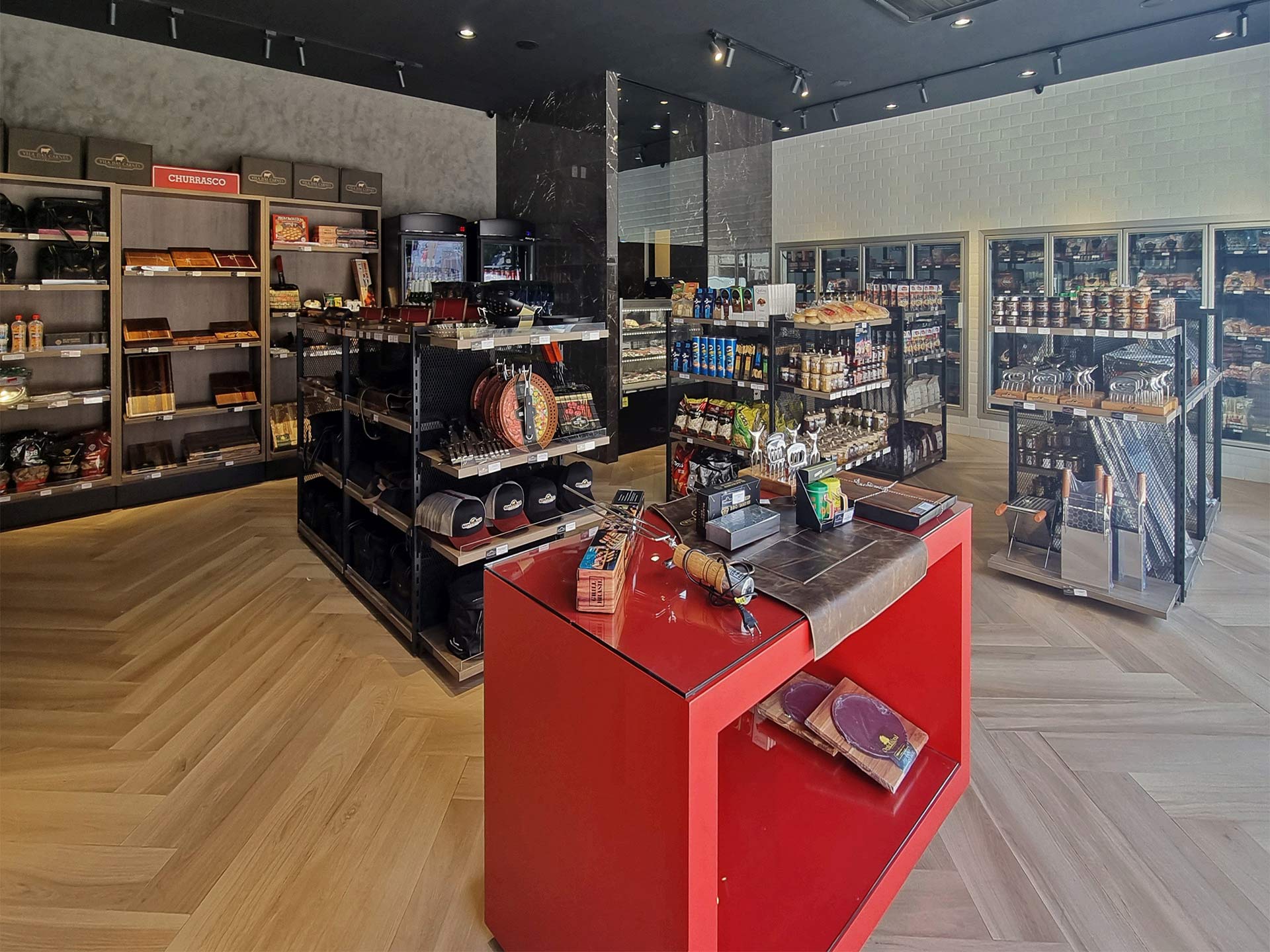 Carnes resfriadas e congeladas. Cervejas, vinhos e destilados. Aperitivos e acompanhamentos. Molhos e temperos. Utensílios de churrasco.